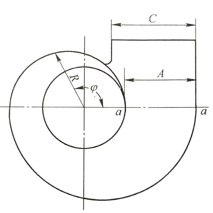 蝸殼的蝸板是一條對數(shù)螺旋線(如下圖所示)。為了制造方便,一般將蝸殼設計制成等寬的矩形斷面。