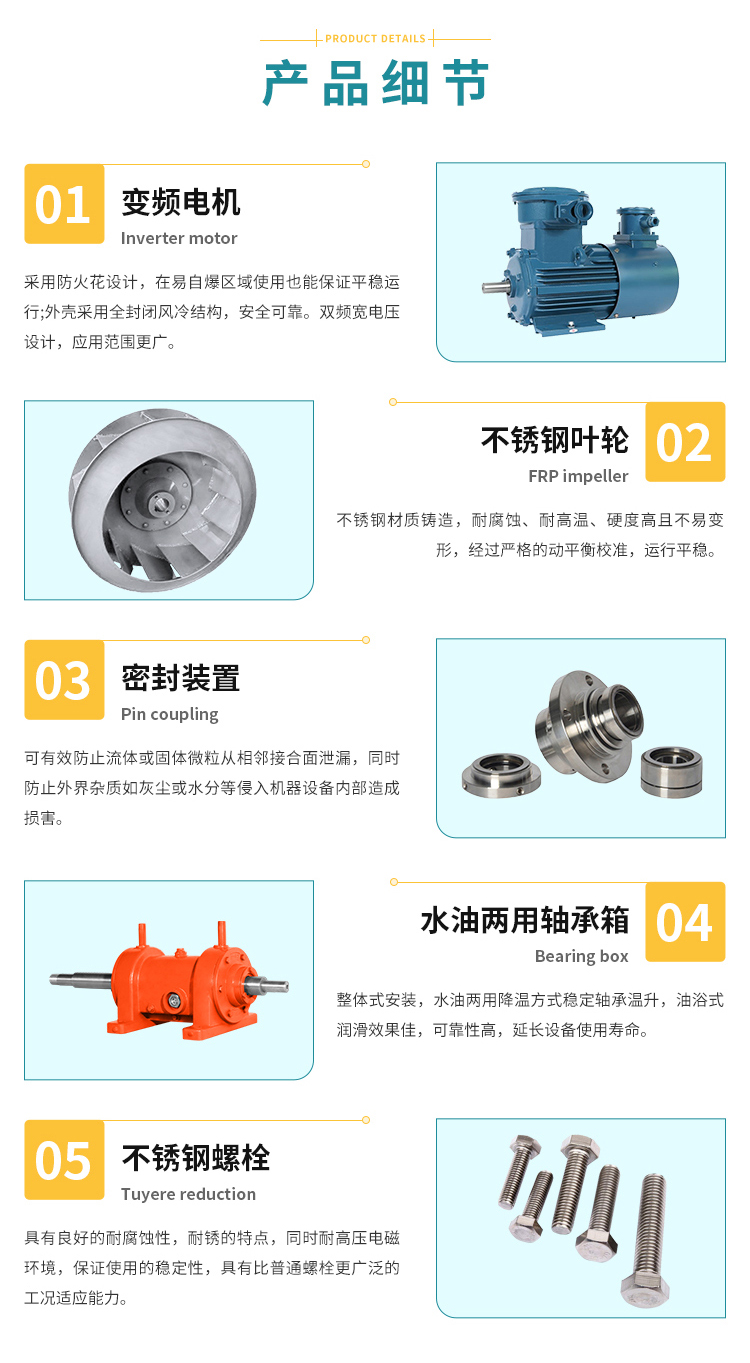 耐高溫、耐銹蝕,具有良好的氣動性,運(yùn)轉(zhuǎn)平穩(wěn)、振動小、效率高、使用壽命長。
