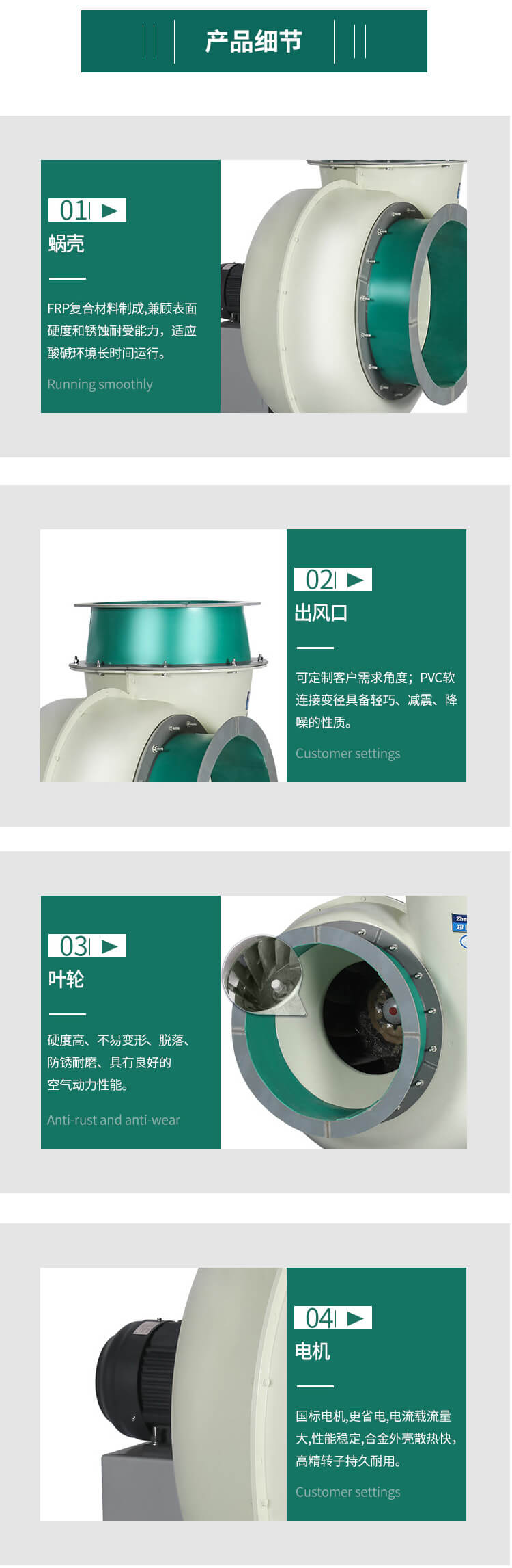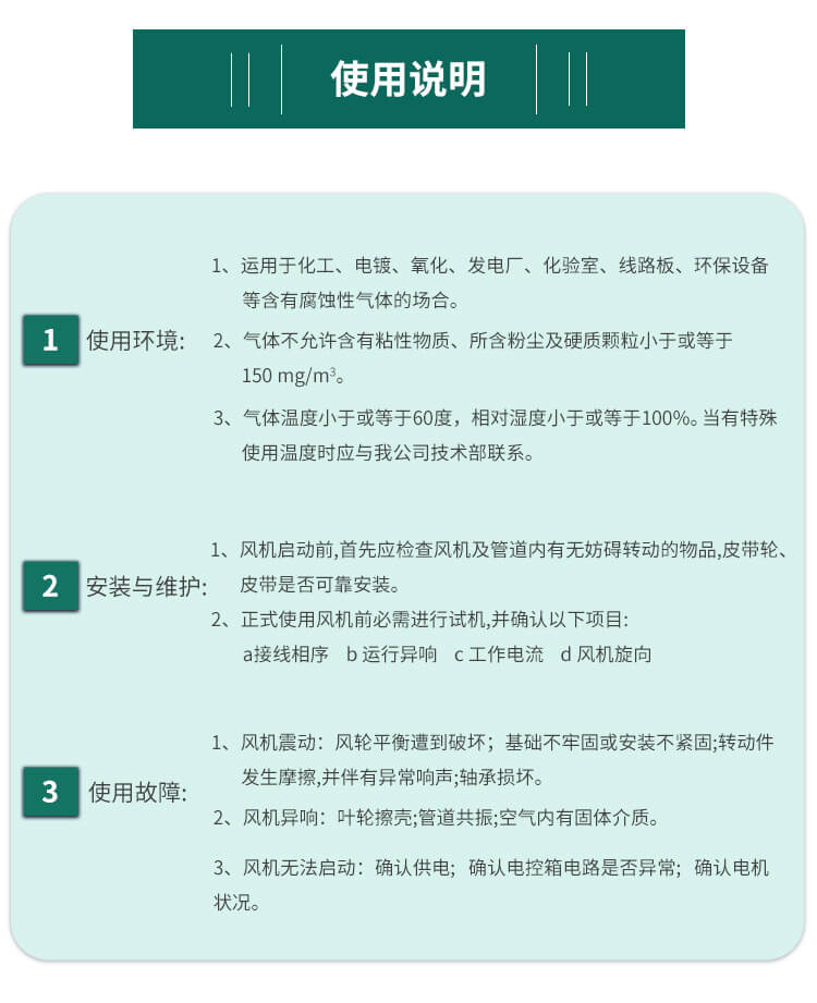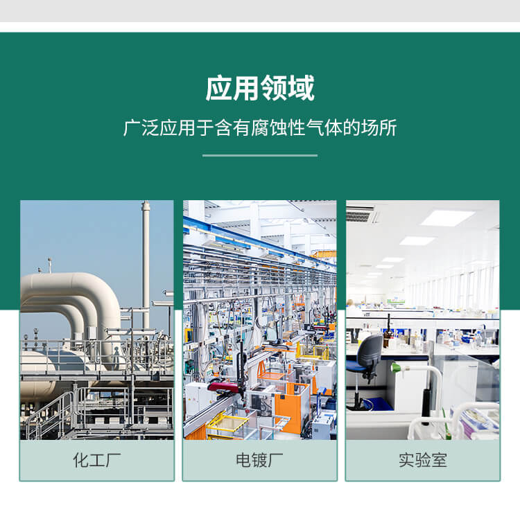 適用于化工廠、紡織、電鍍、實(shí)驗室等場所排送含有一定濃度的酸、堿、鹽等腐蝕性氣體,也可以作為一般工廠的建筑物通風(fēng)換氣用