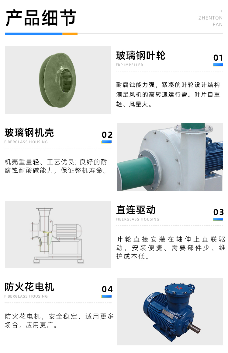 要由玻璃鋼材質(zhì)制成,大機(jī)號也可以制成皮帶驅(qū)動,耐腐蝕性好、不易老化。噪聲低、重量輕