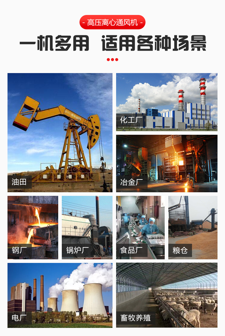 一般用于鍛冶爐、玻璃、陶瓷、電池、無線電等行業(yè)高壓強制送排風(fēng),糧食、飼料、礦粉等加工行業(yè)的物料輸送,紙箱機械設(shè)備、鋼化玻璃設(shè)備等配套使用。