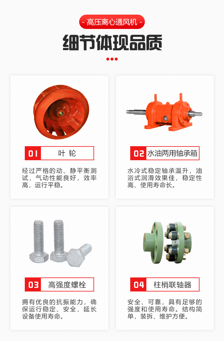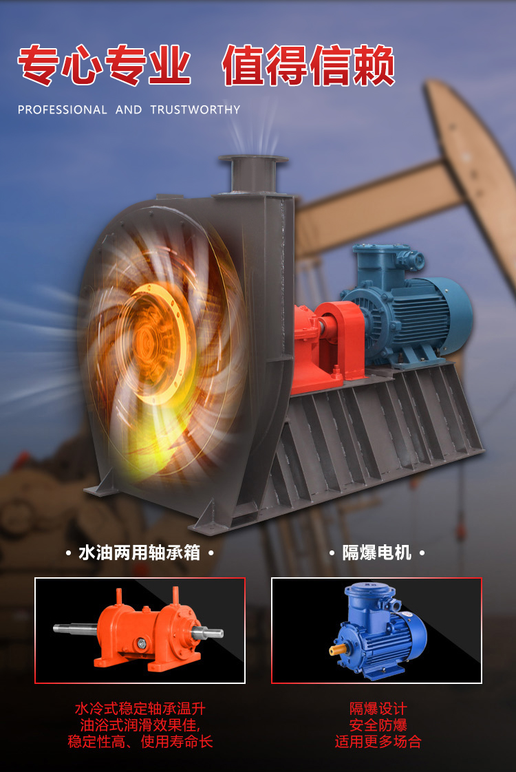 該高壓離心通風(fēng)機為單吸入式,高壓小流量離心風(fēng)機。適用于油田、電站、冶金、化工等行業(yè)的高壓強制送風(fēng)。輸送空氣及無腐蝕性不自燃、不含黏性物質(zhì)的氣體。介質(zhì)溫度一般不超過 50°C(最高不超過80°C),介質(zhì)中所含塵土及硬質(zhì)顆粒不大于150mg/m.動平衡等級符合IS0-1940 G2.5等級,振動值符合ISO-2372 4.5等級要求水準(zhǔn)以上。