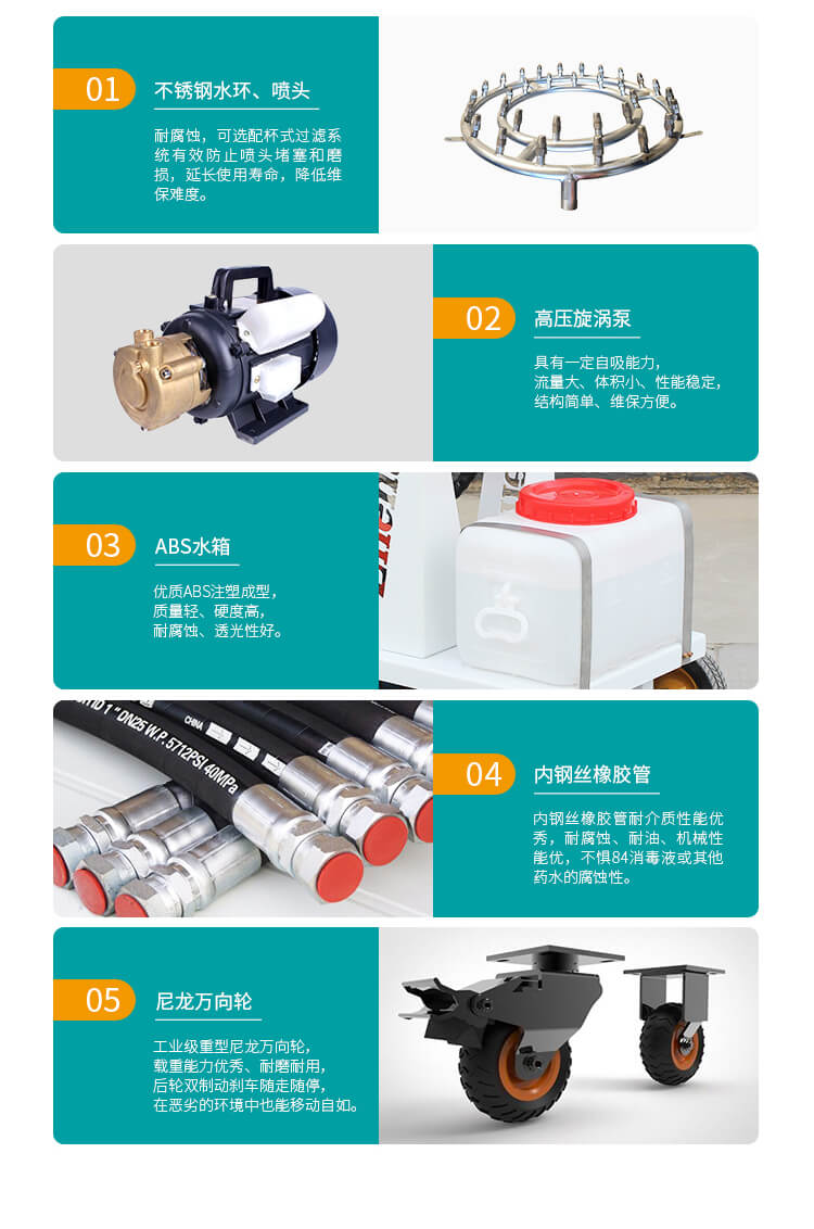 配備大容量ABS防腐水箱、不銹鋼水環(huán)、耐腐蝕橡膠軟管,不懼消毒水腐蝕性;電源可選配220V電源或48V直流電瓶,綠色能源噪聲低無污染,移動(dòng)范圍不受電源問題限制,可勝任更多環(huán)境下噴灑任務(wù)。