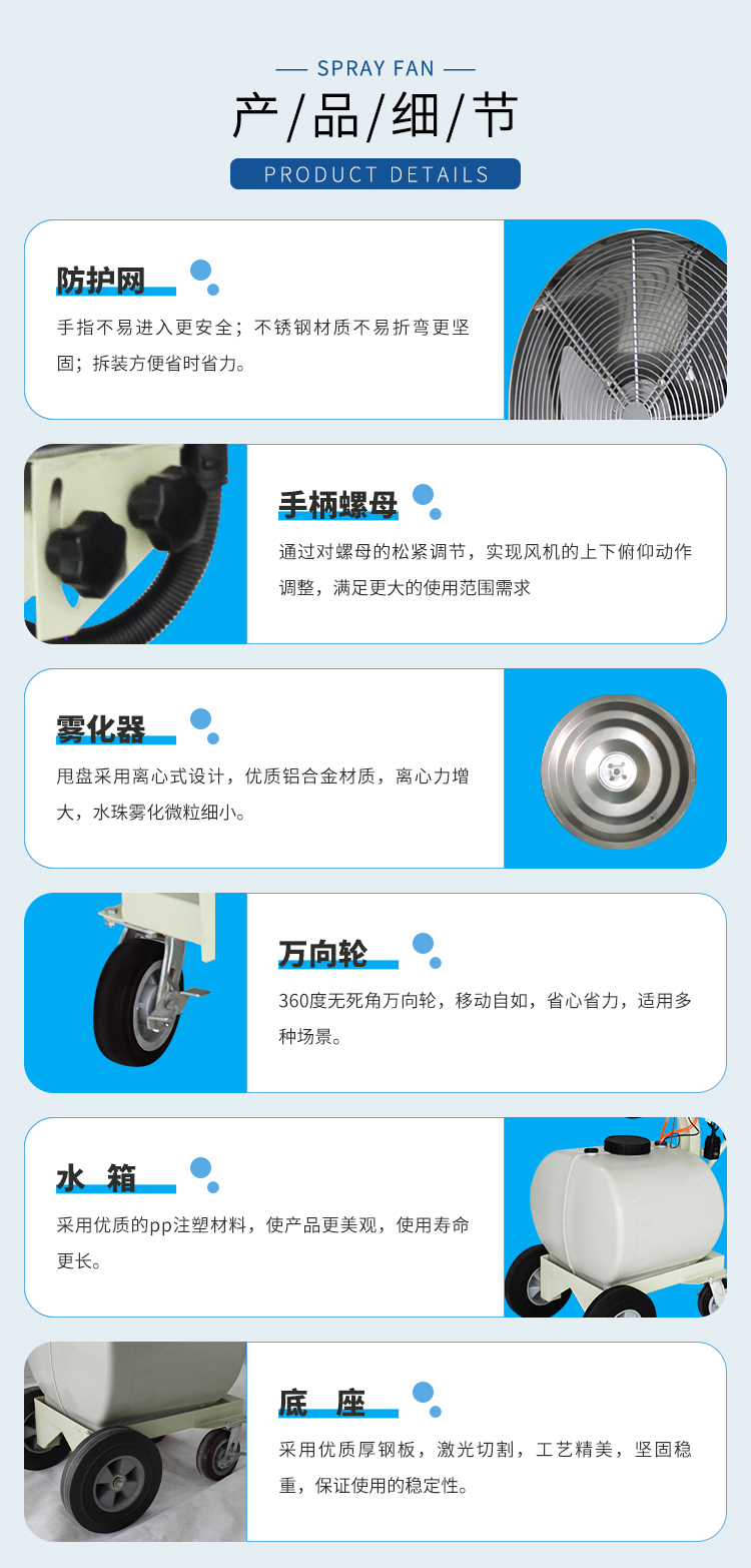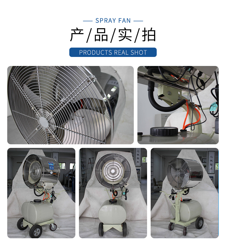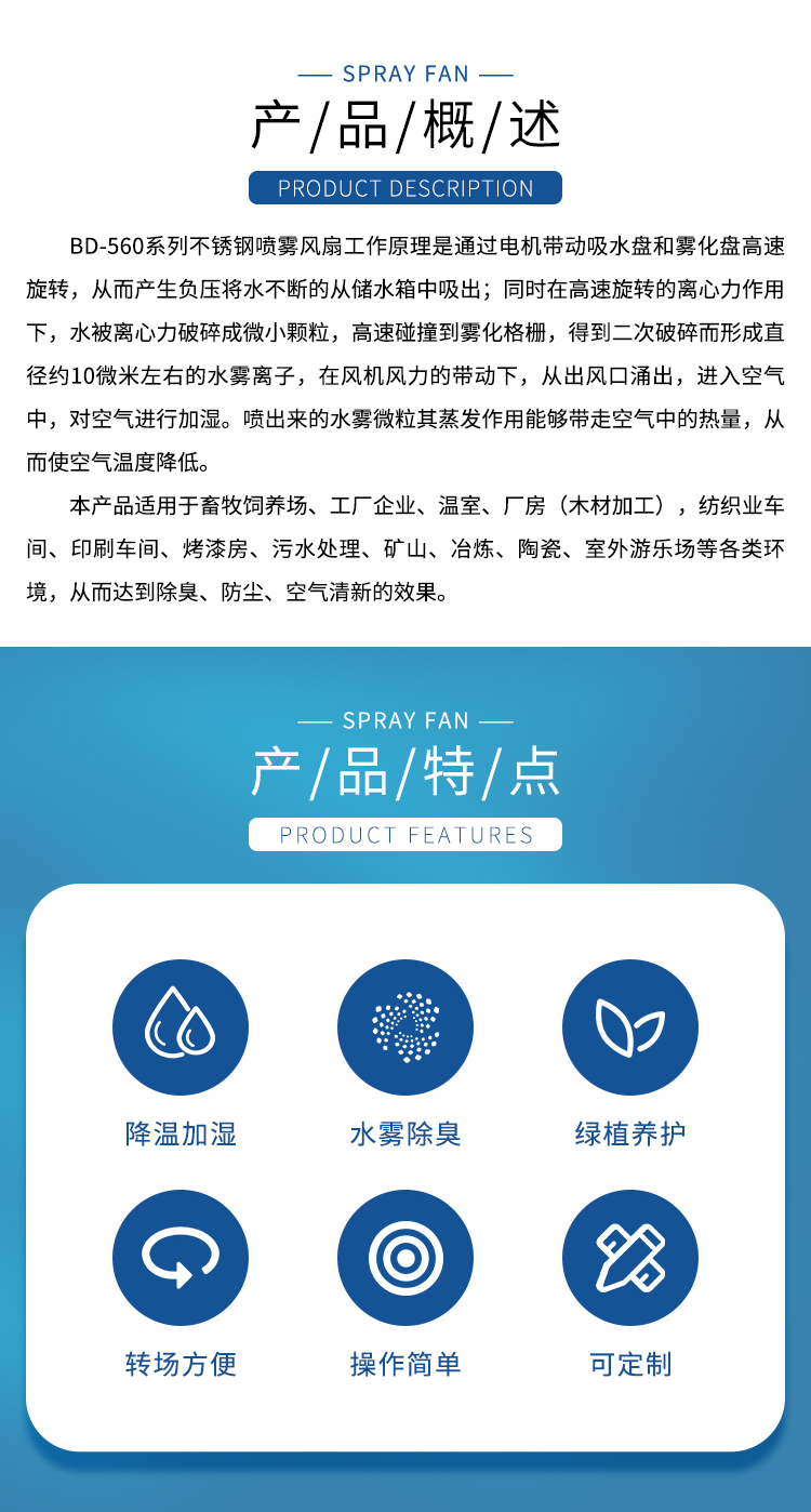 BD-560系列不銹鋼噴霧風(fēng)扇工作原理是通過電機(jī)帶動吸水盤和霧化盤高速旋轉(zhuǎn),從而產(chǎn)生負(fù)壓將水不斷的從儲水箱中吸出;同時在高速旋轉(zhuǎn)的離心力作用下,水被離心力破碎成微小顆粒,高速碰撞到霧化格柵,得到二次破碎而形成直徑約10微米左右的水霧離子,在風(fēng)機(jī)風(fēng)力的帶動下,從出風(fēng)口涌出,進(jìn)入空氣中,對空氣進(jìn)行加濕。噴出來的水霧微粒其蒸發(fā)作用能夠帶走空氣中的熱量,從而使空氣溫度降低。