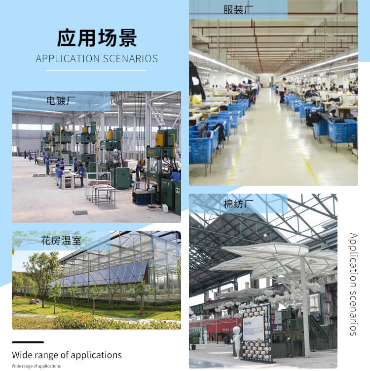 適用于高溫或有異味的車間,勞動密集型企業(yè),園藝溫室大棚、畜牧場、倉儲物流等需要通風(fēng)降溫或一定濕度的領(lǐng)域,如熱處理廠、皮件廠、電鍍廠、印染廠、車間、網(wǎng)吧、棉紡廠、毛紡廠等。