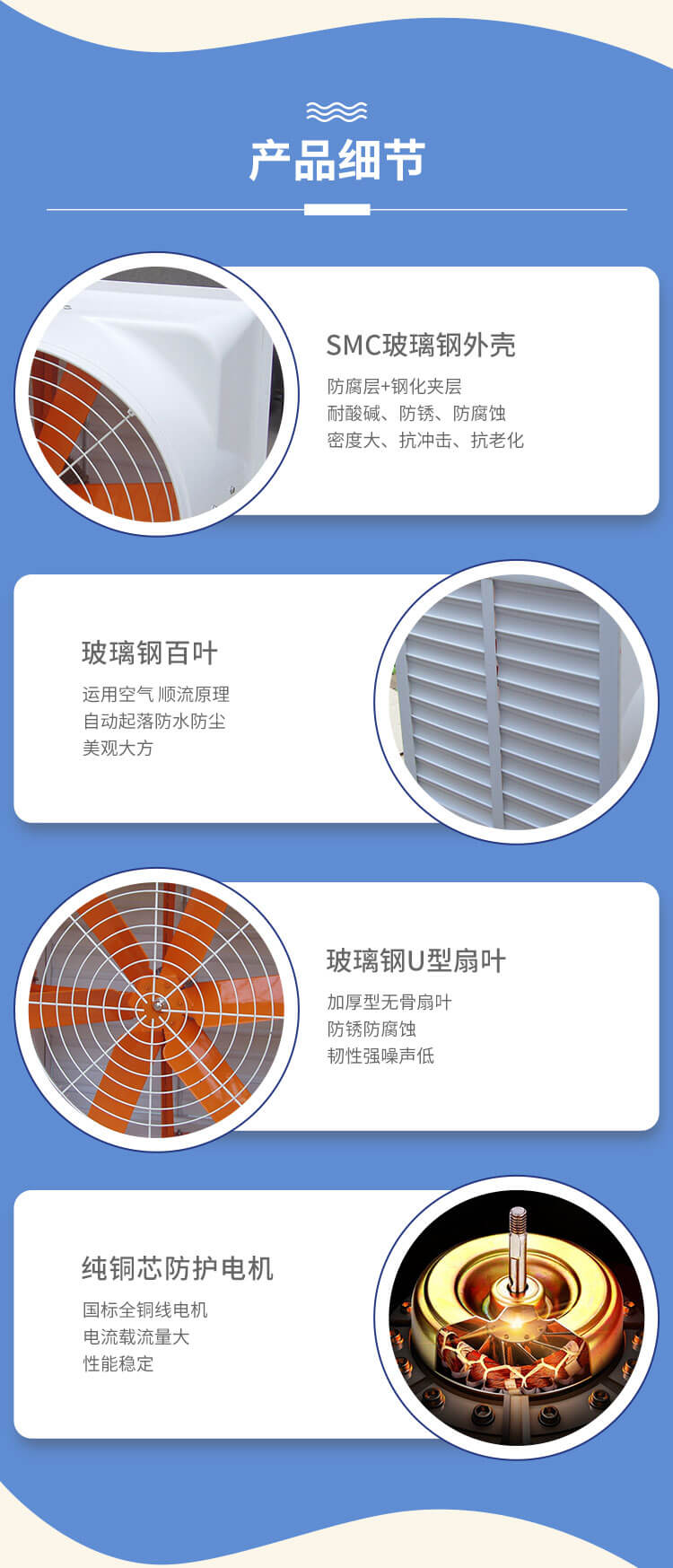 具有抗紫外線,耐酸堿,防腐、防銹等特點(diǎn),采用CAD/CAM優(yōu)化設(shè)計(jì)制造,全壓高,風(fēng)量大,噪音低,耗能小,運(yùn)行平穩(wěn),壽命長,百葉窗可通過手動(dòng)或自動(dòng)啟動(dòng)達(dá)到防塵防水的目的,美觀大方,電機(jī)下置,維護(hù)保養(yǎng)更方便。