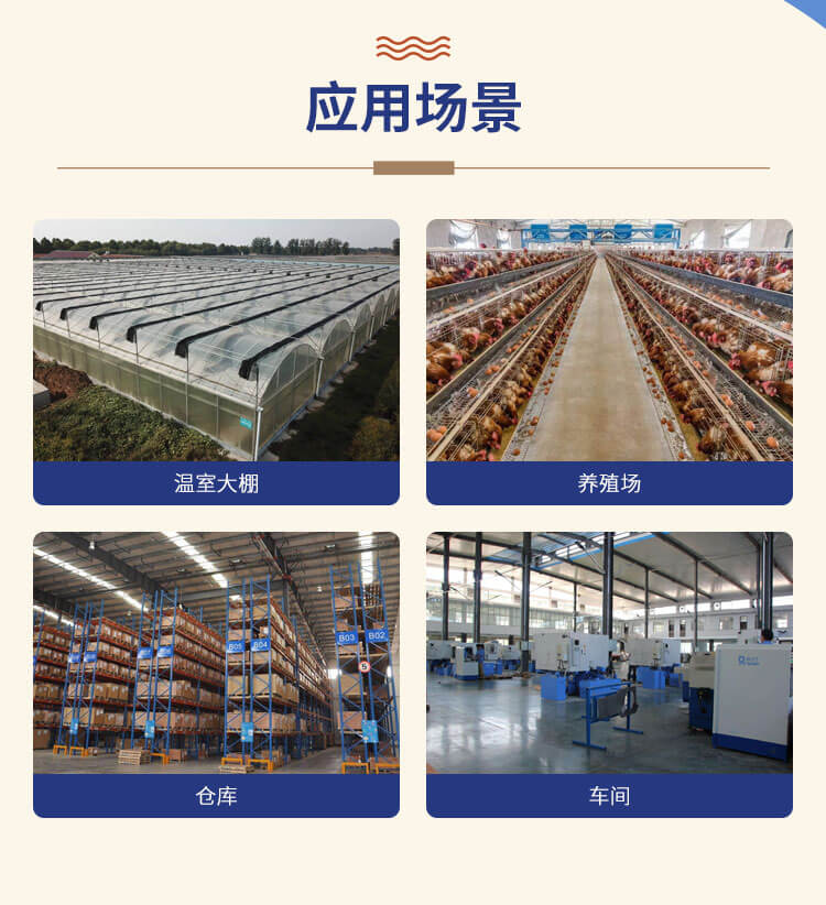 畜牧業(yè)、生產(chǎn)車間、倉庫等易產(chǎn)生廢棄、高溫、有異味、散熱或?qū)諝鉂穸扔邢拗茍鏊?,?duì)空氣干濕度無限制領(lǐng)域通風(fēng)換氣。