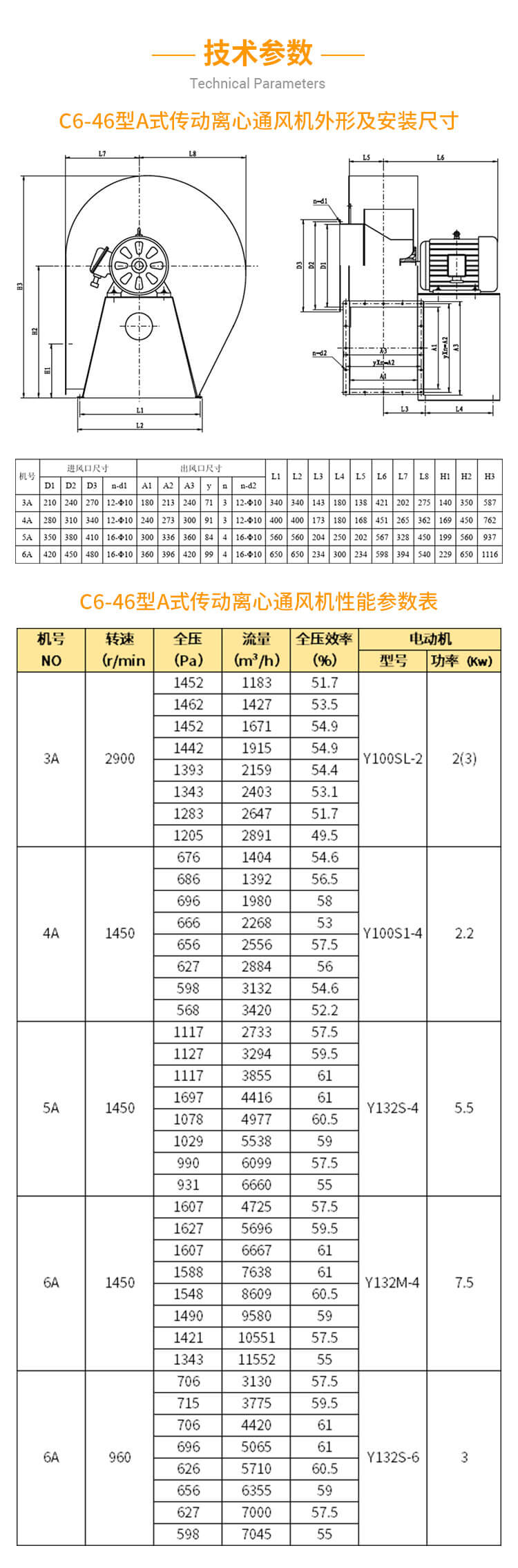 C6-46型排塵離心通風(fēng)機(jī)具有6個(gè)向前彎曲的葉片,平板的前盤和后盤及鑄鐵輪轂。葉輪經(jīng)動(dòng)平衡校正,運(yùn)轉(zhuǎn)平穩(wěn)。主軸采用優(yōu)質(zhì)碳素鋼制造。為了安裝檢修方便,除No.3 ~No.6小型通風(fēng)機(jī)的機(jī)殼為整體外,No.8 ~No.12風(fēng)機(jī)分為兩部分,用螺栓連接。