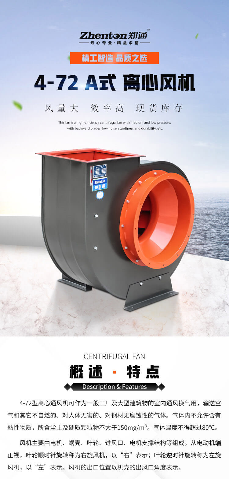 4-72型離心通風(fēng)機可作為一般工廠及大型建筑物的室內(nèi)通風(fēng)換氣用,輸送空氣和其它不自燃的、對人體無害的、對鋼材無腐蝕性的氣體。氣體內(nèi)不允許含有黏性物質(zhì),所含塵土及硬質(zhì)顆粒物不大于150mg/m3。氣體溫度不得超過80°C。