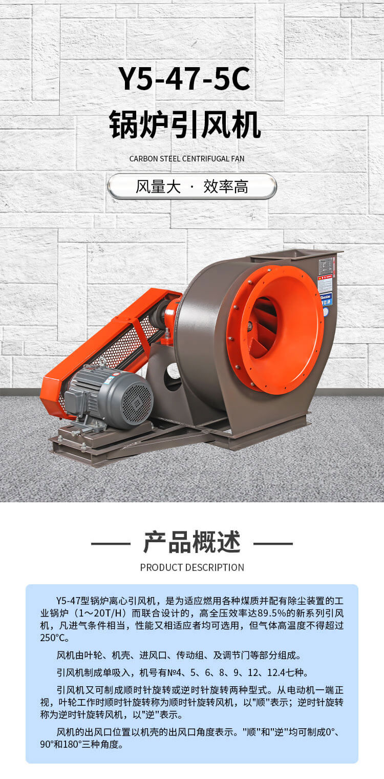 Y5-47-C鍋爐引風機,適用于燃用各種煤質并配有消煙除塵裝置 的0.2-20t/h工業(yè)鍋爐,以為進氣條件相當、性能又相適應者均可采用,但最高溫度不超過250℃。
