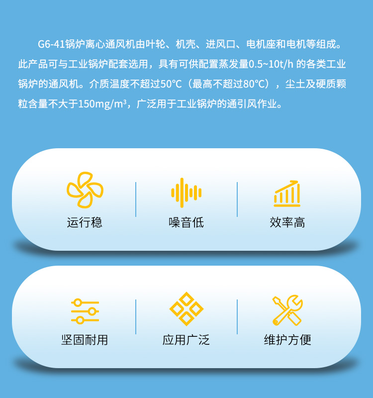 1.適用于燃用各種煤質(zhì) 并配有消煙除塵裝置的、 蒸發(fā)量0.5~ 10t/h的各 類工業(yè)鍋爐。 2、高溫烘烤設(shè)備的熱風(fēng) 循環(huán)風(fēng)機(jī)。 3、使用環(huán)境:氣體介質(zhì) 中不含腐蝕及易燃易爆 氣體,介質(zhì)中粉塵及硬 顆粒雜質(zhì)含量不超過 200mg/m3,長期運(yùn)行 介質(zhì)溫度不超過250°C。