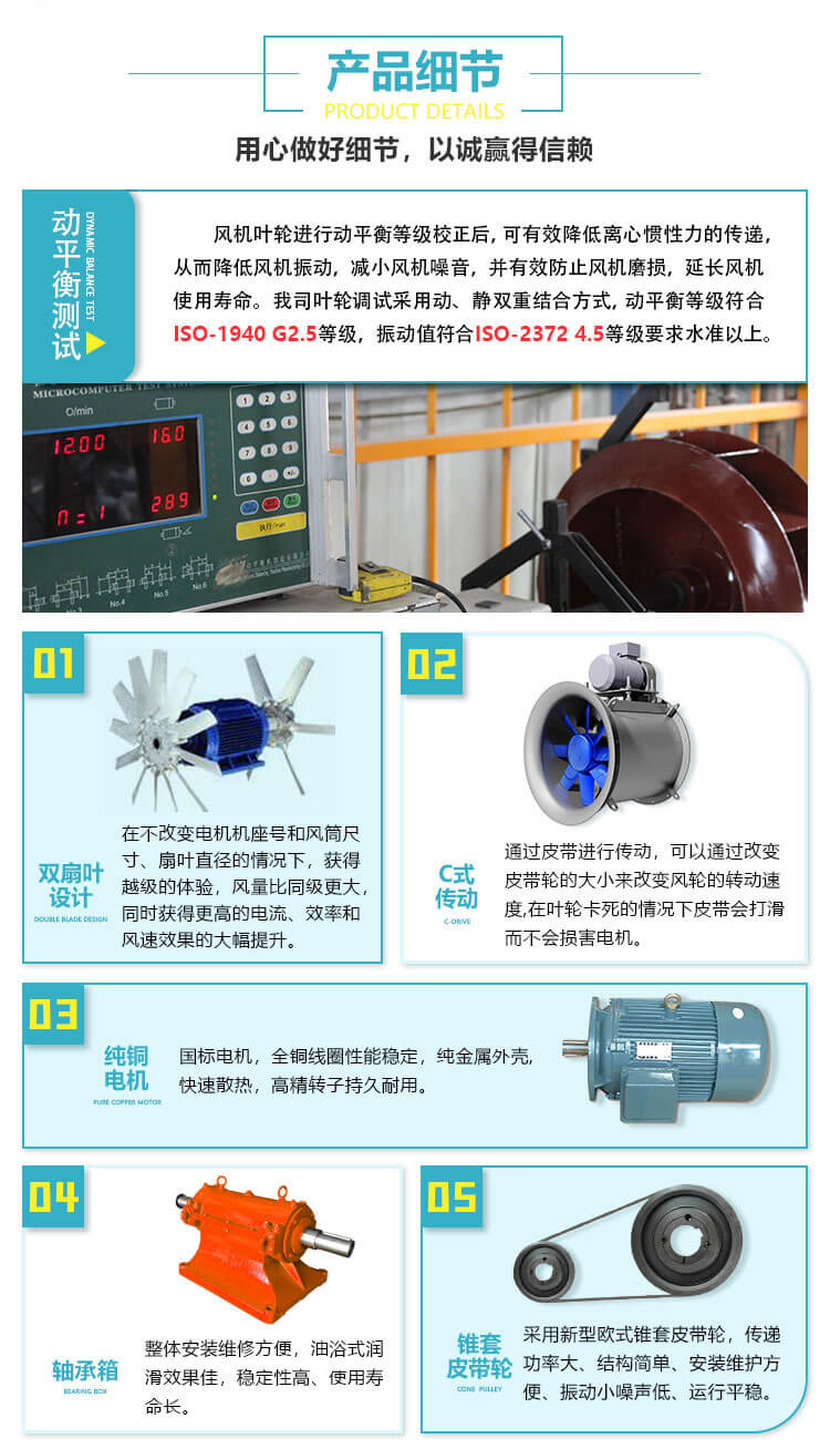 該系列產(chǎn)品由葉輪、機殼、電機、軸承和傳動裝置組成。在葉輪圓周速度不超過60m/s條件下,配用2900r/min、1450r/min、960r/min三種轉(zhuǎn)速。該系列產(chǎn)品,按葉輪直徑不同共分成10種機號,依次排列為No.2/2、3、3/2、 4、5、6、7、8、9、10等。每一 種機號葉片又可安裝成15°、20°、25°、 30°、 35°共五種角度。