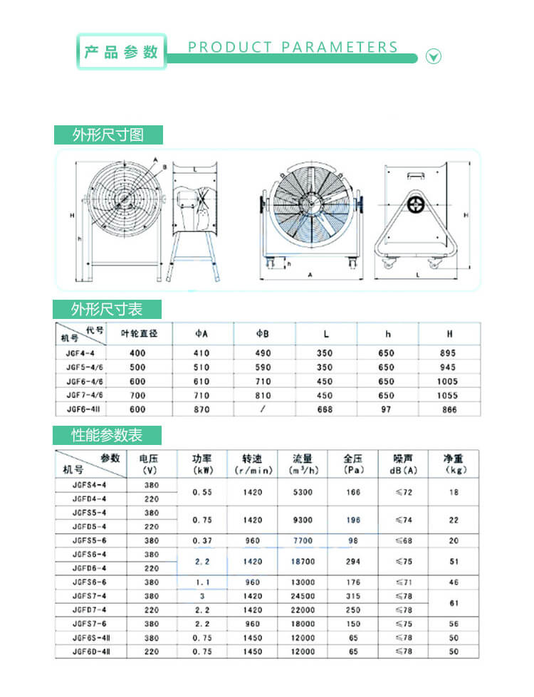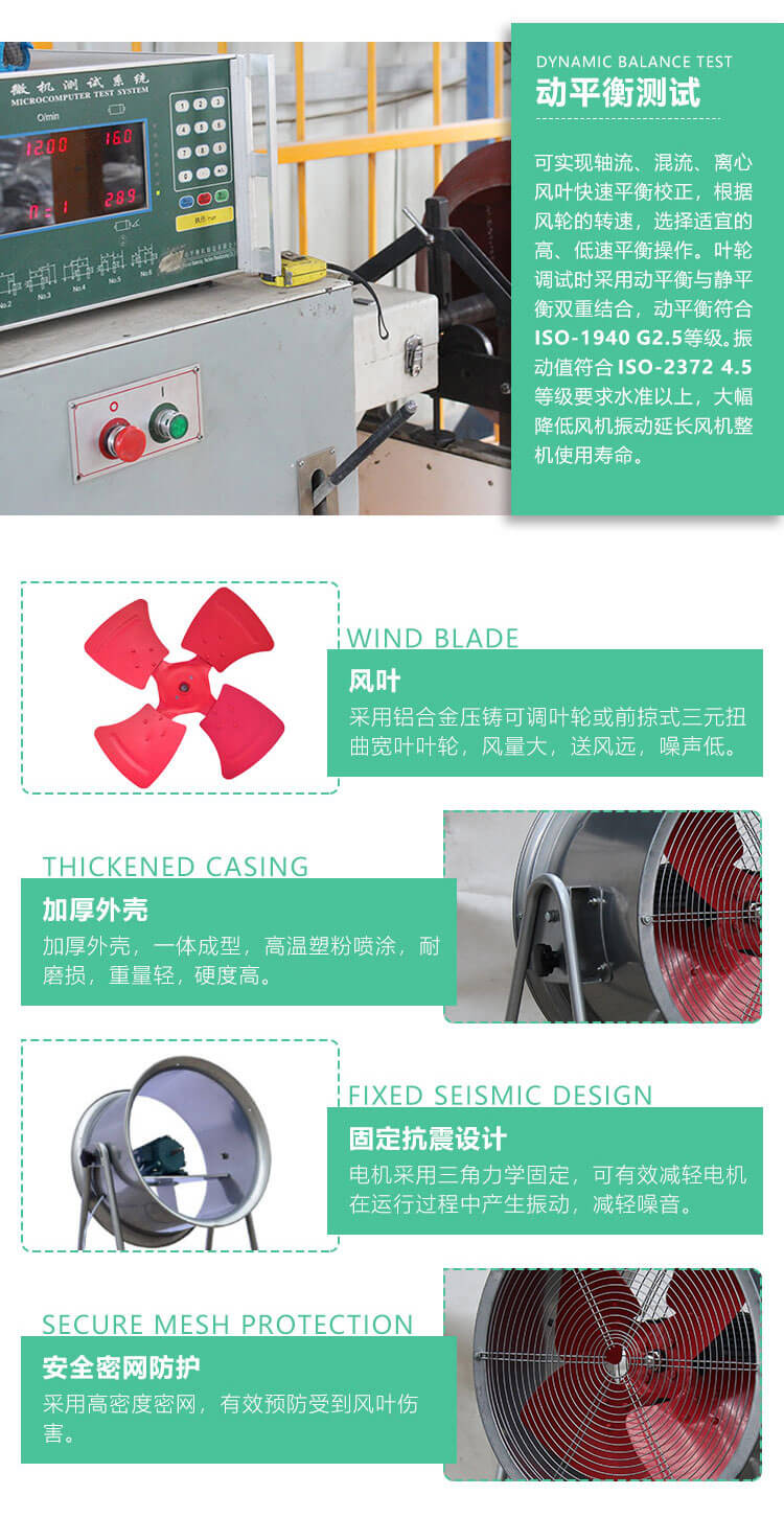 JGF低噪音崗位式軸流風(fēng)機(jī)風(fēng)葉可采用鋁合金壓鑄可調(diào)葉輪或前掠式三元扭曲寬葉葉輪,風(fēng)量大、送風(fēng)遠(yuǎn)、噪聲低