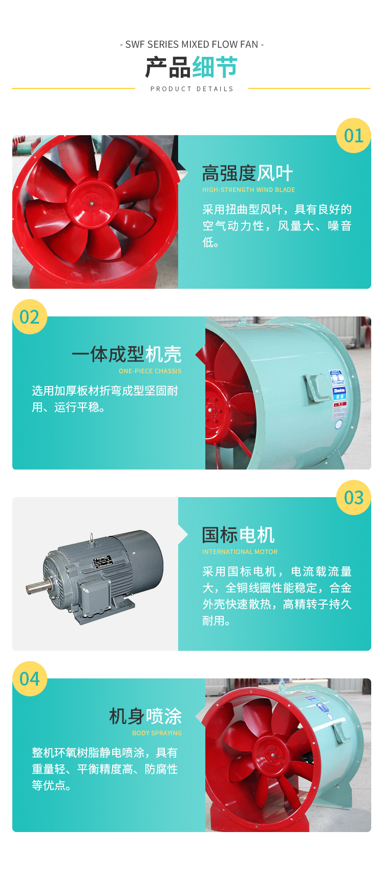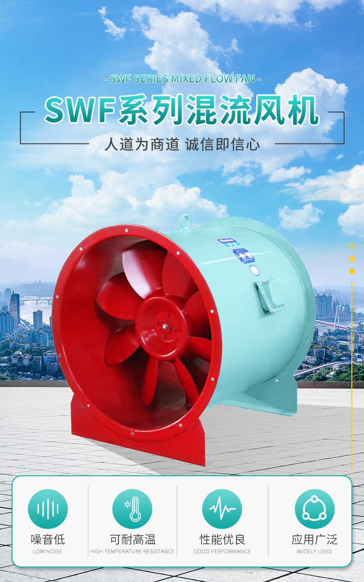 SWF型混流風(fēng)機(jī)多用于冷凍、空調(diào)、紡織、船舶、民用建筑等空調(diào)工程通風(fēng)換氣,普通材質(zhì)風(fēng)機(jī)可輸送空氣和腐蝕性、不自燃的氣體。